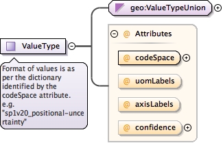 <complexType name="ValueType"><annotation><documentation>Format of values is as per the dictionary identified by the codeSpace attribute. e.g. "sp1v20_positional-uncertainty"</documentation></annotation><simpleContent><extension base="geo:ValueTypeUnion"><attribute name="codeSpace" type="anyURI" use="required"/><attribute name="uomLabels" type="gml:NCNameList"/><attribute name="axisLabels" type="gml:NCNameList"/><attribute name="confidence" type="geo:ConfidenceTypeEnumeration"/></extension></simpleContent></complexType>